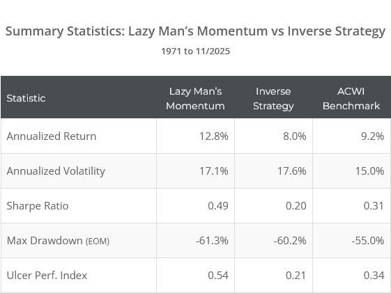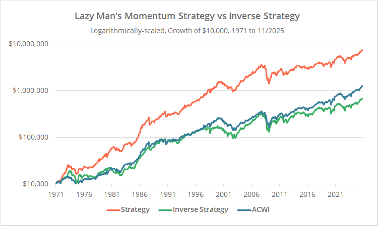 The main reason is that ACWI is a cap-weighted index. For example, the US currently makes up 63% of holdings, while New Zealand makes up just 0.05%. This strategy strips away that cap weighting. Allocation to each country is equal. The fact that even the inverse strategy almost matches the benchmark shows that much of the strategy’s outperformance has come from this equal weighting (and not momentum) (*).
