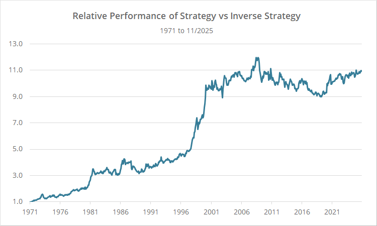 When relative performance is rising, the strategy is outperforming, and when it’s falling, the inverse strategy is outperforming. When it’s flat, it means the strategy is no more predictive than a coin flip.