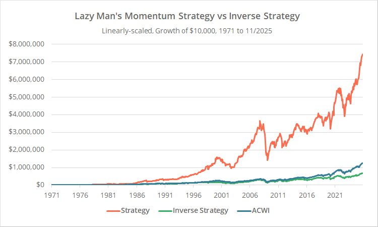 The main reason is that ACWI is a cap-weighted index. For example, the US currently makes up 63% of holdings, while New Zealand makes up just 0.05%. This strategy strips away that cap weighting. Allocation to each country is equal. The fact that even the inverse strategy almost matches the benchmark shows that much of the strategy’s outperformance has come from this equal weighting (and not momentum) (*).