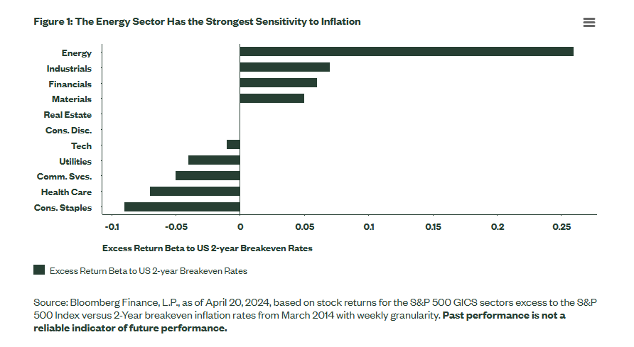 When inflation expectations are rising, Energy, Industrials, Financials and Materials tend to also rise. Conversely, Utilities, Health Care and Staples tend to rise when inflation expectations are falling.