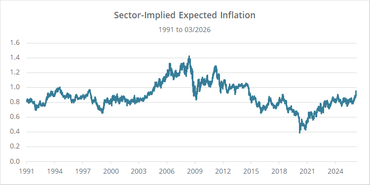 By dividing the positive expected inflation portfolio by the negative we create a “Sector-Implied Expected Inflation” indicator: