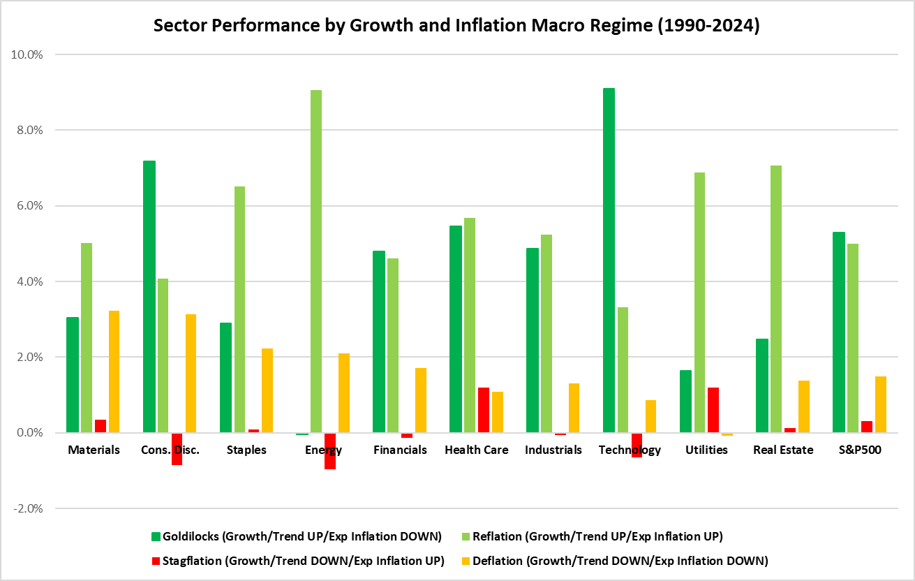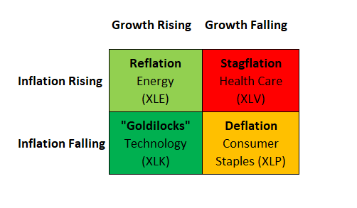 The standout performer during the “goldilocks” regime (growth up, inflation down) has clearly been technology (XLK). During reflation (growth up, inflation up) it has been energy (XLE).