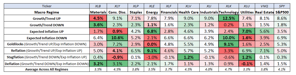 Varadi then breaks down how various stock market sectors perform during each market regime: growth up/down and inflation expectation up/down.