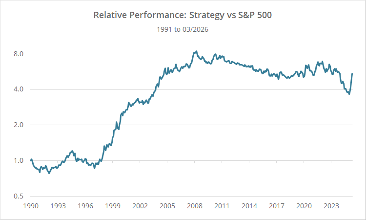 Over the long-term, it would have reduced broad market drawdowns, but would have also failed to outperform the broad market since 2008. To illustrate, below we show the relative performance of Varadi’s strategy versus the S&P 500 since 1991:
