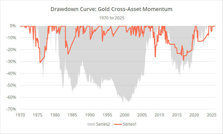 Like most assets, when gold is showing positive momentum, it has usually been followed by stronger future returns. If the strategy stopped there, it would still provide a significant benefit to simply buying and holding gold.