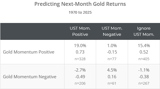 To illustrate, below we’ve shown next month gold performance following months when gold and US Treasury momentum (as measured by 12m return) was either positive or negative, as well as when ignoring treasury momentum altogether.