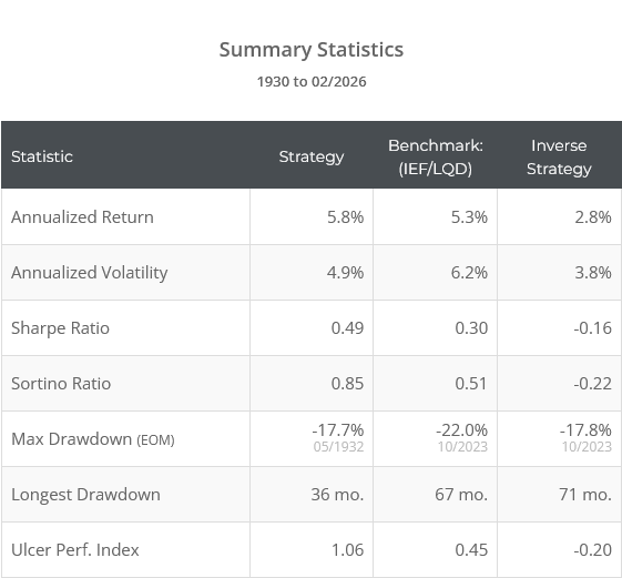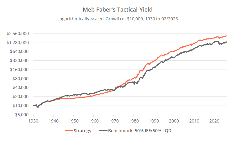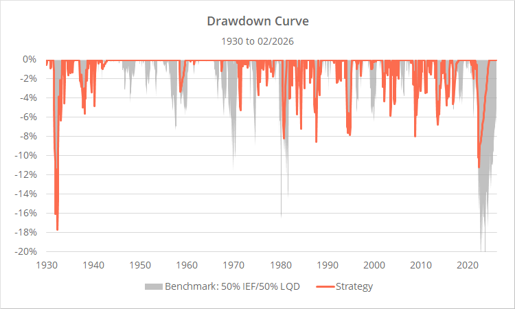 Backtested results from 1930 follow compared to a benchmark of 50% int-term US Treasuries (IEF) and 50% US corporate bonds (LQD). Results are net of transaction costs – see backtest assumptions. Learn about what we do and follow 100+ asset allocation strategies like this one in near real-time.