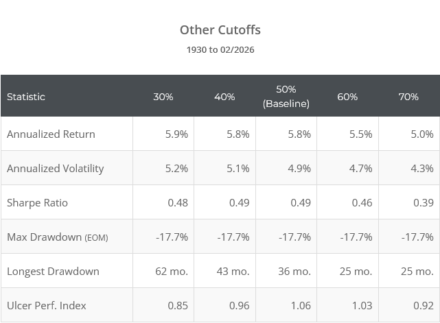 The strategy sets the premium cutoff at the “top half” of historical observations as of that moment in time. There’s nothing magical about that cutoff. In the table below, we test versions of the strategy setting the cutoff at between 30 and 70%.