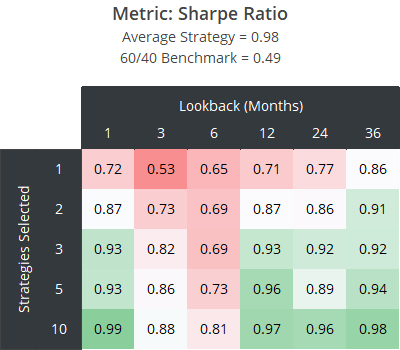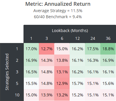 All combinations of lookbacks and portfolio sizes significantly outperformed the average strategy in terms of pure return. That should be unsurprising. We track a wide range of strategies from conservative to aggressive, but selecting the top recent performers (as well as bottom recent performers) will tend to select the riskiest strategies.