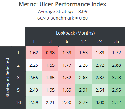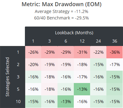 These results tell a similar story. In terms of minimizing drawdown, selecting the 1 to 2 top recent performers has been terrible. No combination has significantly outperformed the average strategy.