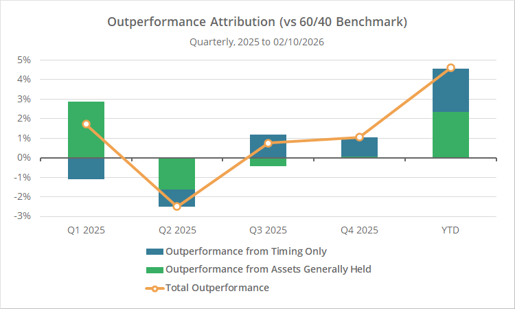 - Q3 and Q4 2025: Generally held assets performed in line with the benchmark both quarters, but timing was good (overweighting gold and intl. assets was a big part of that), resulting in outperformance over the benchmark.
